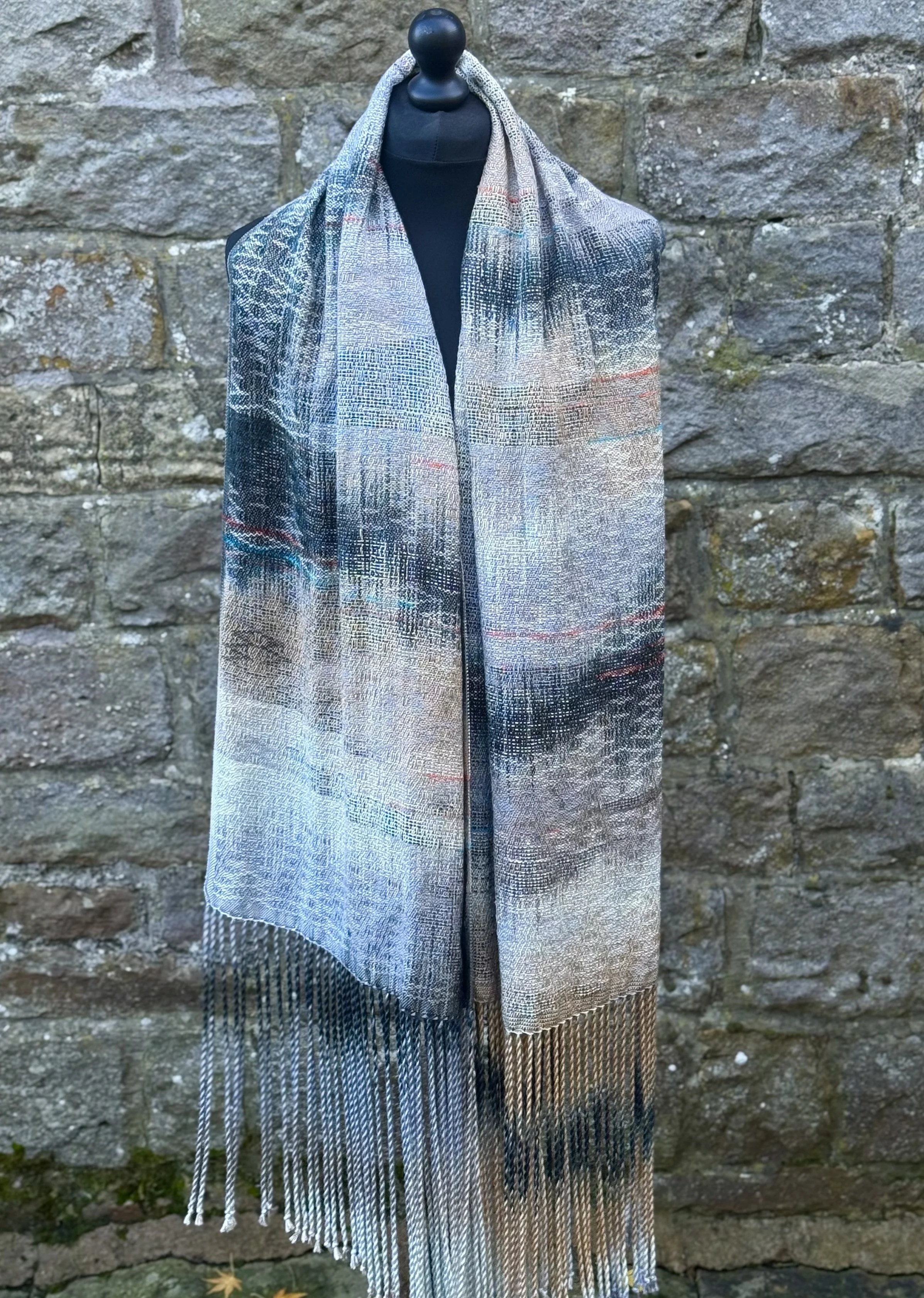 The smaller framed works you’ll find here are glimpses of these woven landscapes. Fragments of sky and moor captured in silk, wool, and linen. Wearable pieces can only be purchased in person. It’s important to me that the texture and balance of a piece suits you as well as the colours, and to judge that, you need to meet a piece in person.